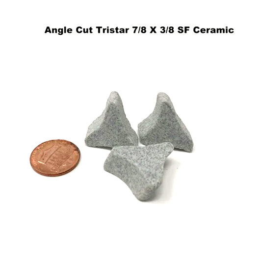 - 150 pounds of Angle Cut Tristar 7/8 X 3/8 SF Ceramic or Similar Equivalent (due to stock availability)and 5 gallons of VF100 compound for processing steel and other hard metals